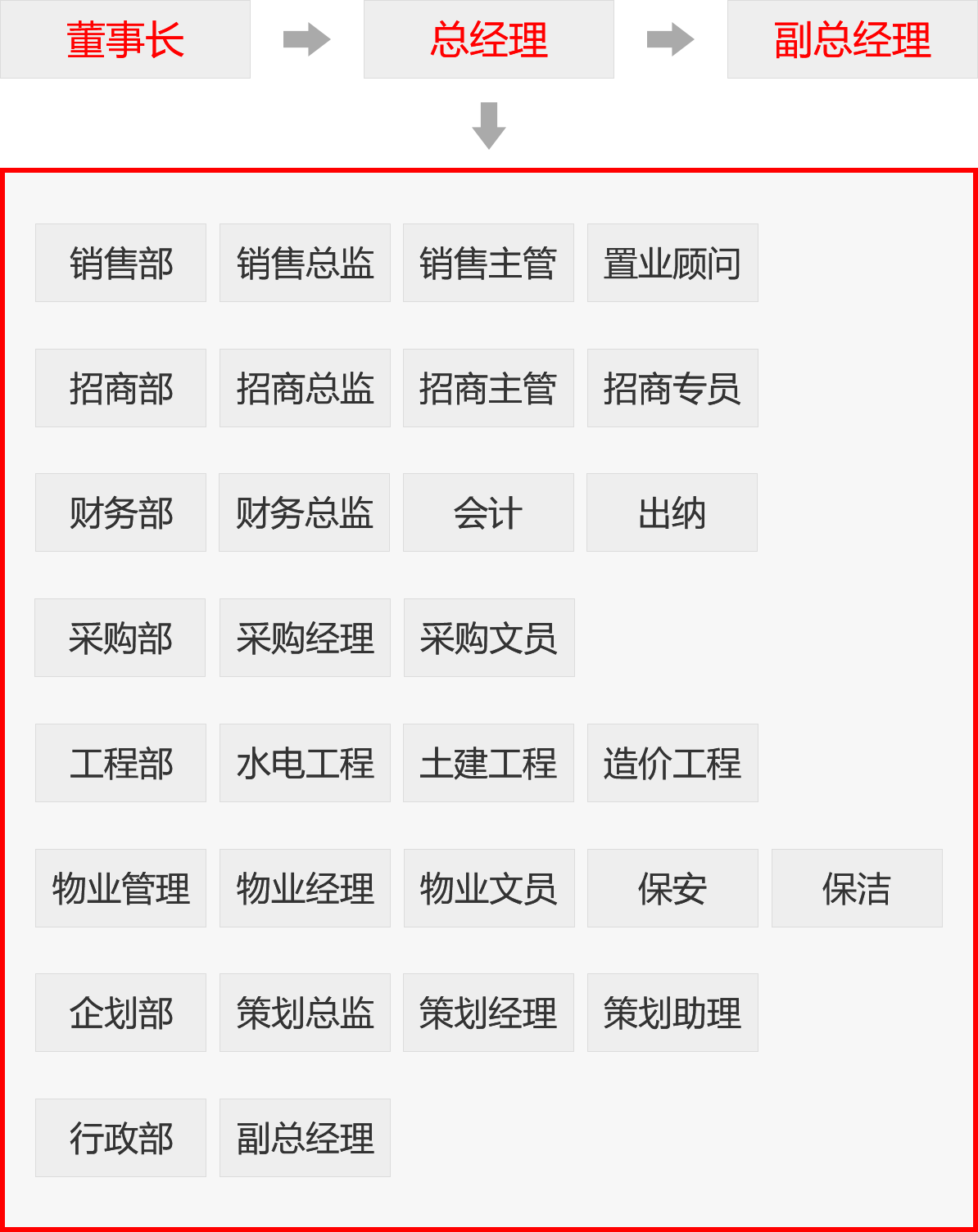 战略是企业运营的总纲,战术是对战略的分解。公司要想达到战略上的要求,必须做好战术层面的运用。为确保战略层制定的方针、政策贯彻到各个职能部门的工作中去,对日常工作进行组织、管理和协调,江西国际汽车广场以整体战略目标为基准点,实施战略层级细分,通过设立人力资源、财务、招商、市场、企划、电商、工程、物业、安保9大板块,各板块配以专业管理人员实施战略目标分解,承上启下,确保全体员工在清晰目标下能劲往一处使,力往一处发,推动战略目标执行。